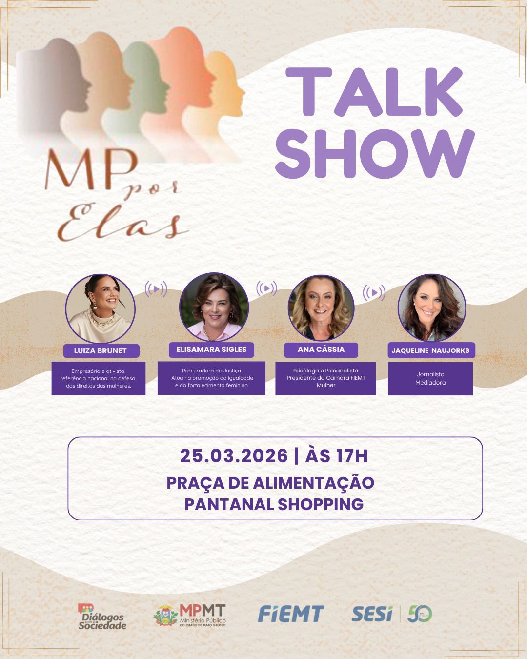 O talk show contará ainda com a participação da procuradora de Justiça Elisamara Sigles Vodonós Portela, da presidente da Câmara da Mulher da Fiemt, Ana Cássia Rangel, e mediação da jornalista Jaqueline Naujorks. Haverá também apresentação musical do Quarteto do Sesi e uma intervenção teatral, ampliando a proposta do evento de sensibilizar o público por meio da arte, da informação e do diálogo.